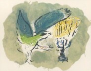 The presence of God is represented almost universally in light and flame. The 7 candle menorah depicted in most of Chagall's work is the traditional symbol of Judaism used year-round in the tabernacle. The 9 candle menorah is used specifically to celebrate Chanukah, 8 for each day of the Festival of Lights plus the shamash, the "helper" used to light the others. Jewish/Russian-born painter Marc Chagall (1887-1985) was one of the 20th century's p...